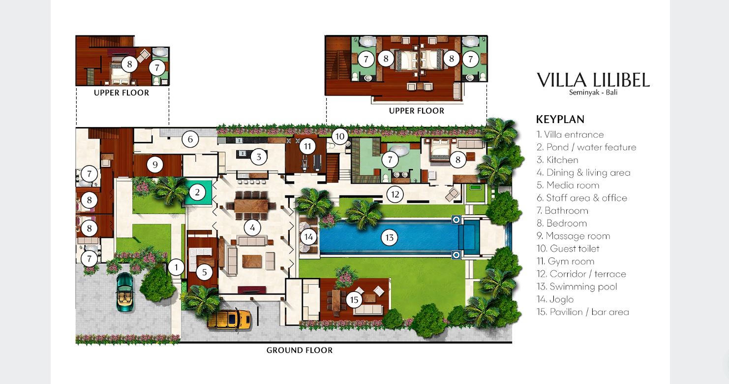 Die Villa verfügt über sechs großzügige Schlafzimmer mit Ensuite-Badezimmern, darunter eine beeindruckende Master-Suite mit Himmelbett, begehbarem Kleiderschrank und integriertem Lounge-Bereich. Besonders hervorzuheben sind der private Fitnessraum mit modernen Geräten sowie der Spa-Raum für entspannende Massagen, die den Aufenthalt in dieser Luxusvilla auf Bali auf ein neues Level heben. Ein separates Media-Zimmer sorgt zusätzlich für Unterhaltung und Rückzugsmöglichkeiten.